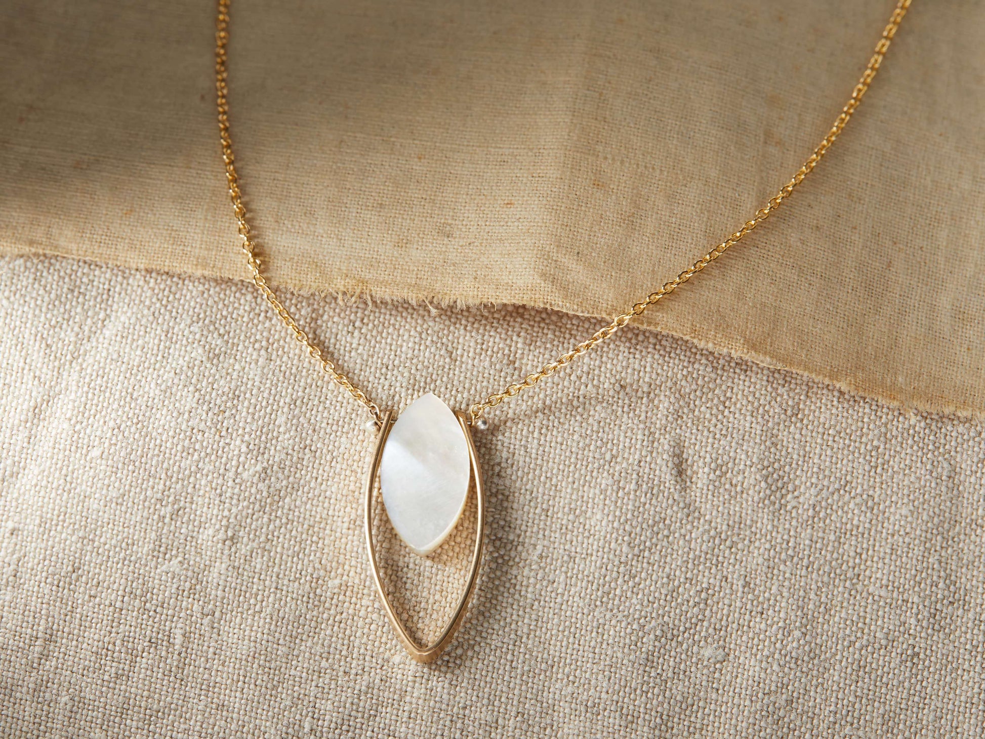 - Gold fill pendant necklace adorned with a gilded lotus petal and marquise-cut mother of pearl gemstone.
