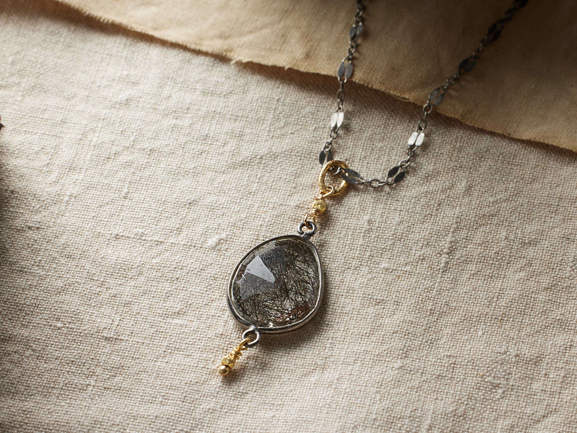 - Crafted from black rutilated quartz and oxidized sterling silver.