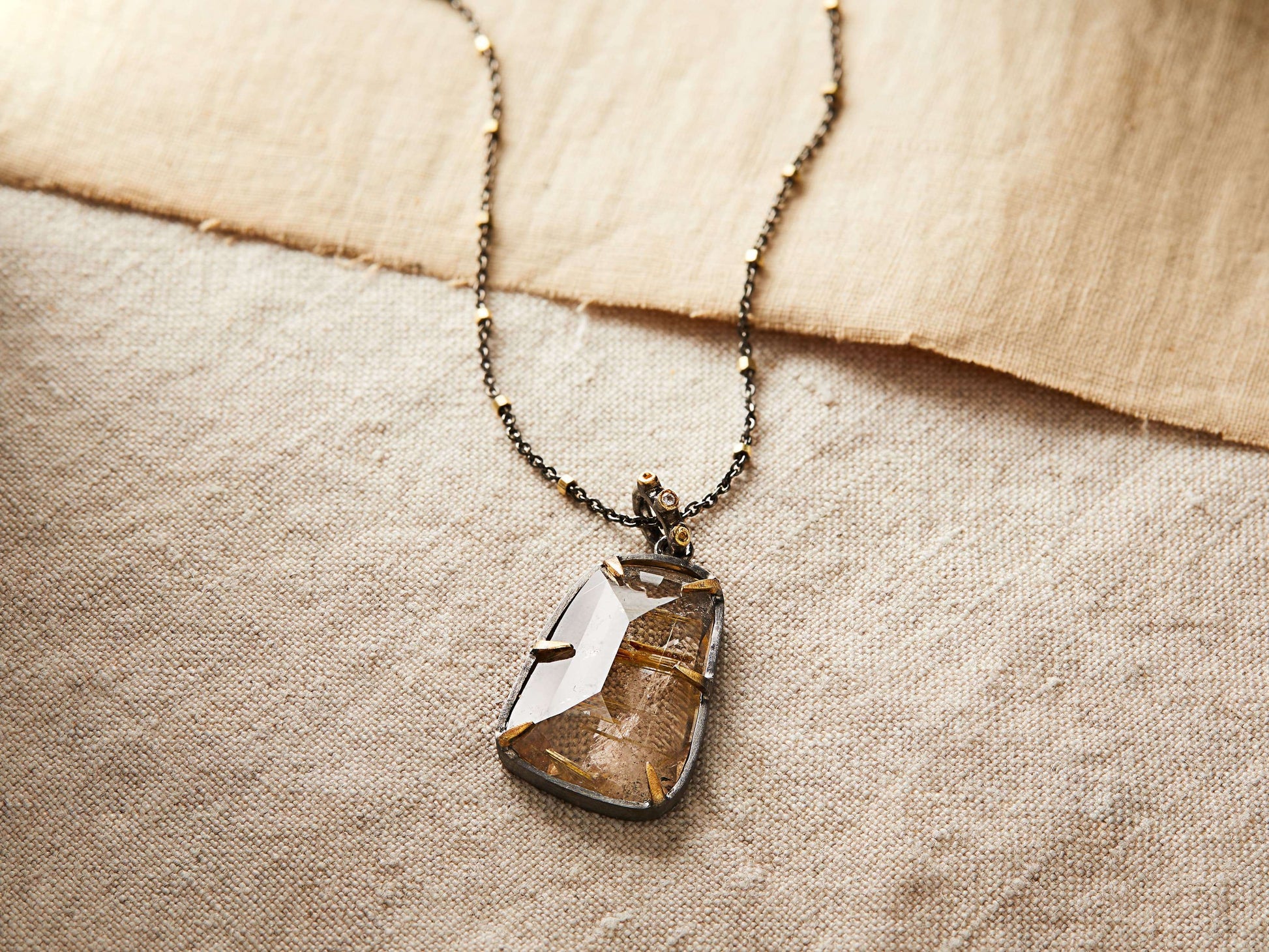 - Crafted from oxidized sterling silver finished with a golden rutilated quartz and white topaz pendant.